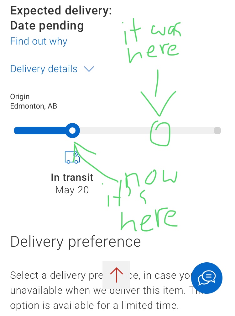 It is the day after my kit was supposed to arrive and the shipping info says “Expected delivery: date pending.” The position of the dot on the tracker thingy has changed.