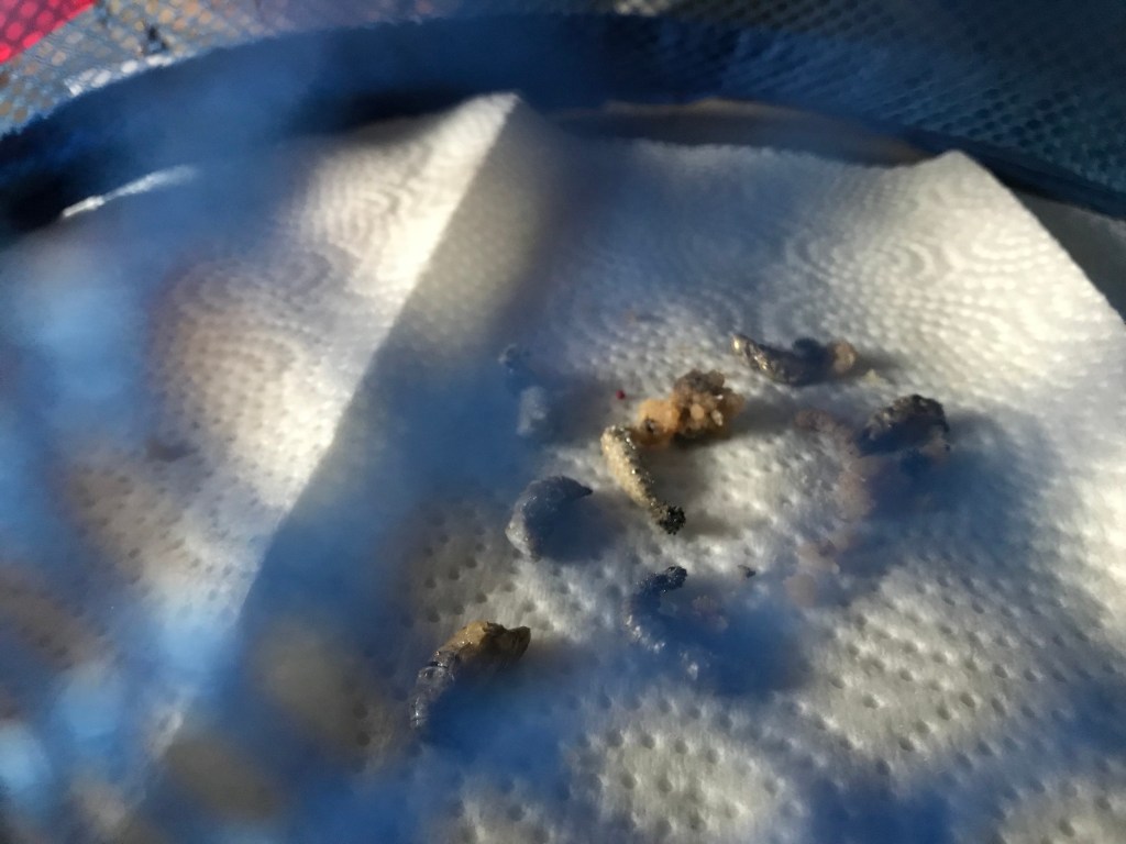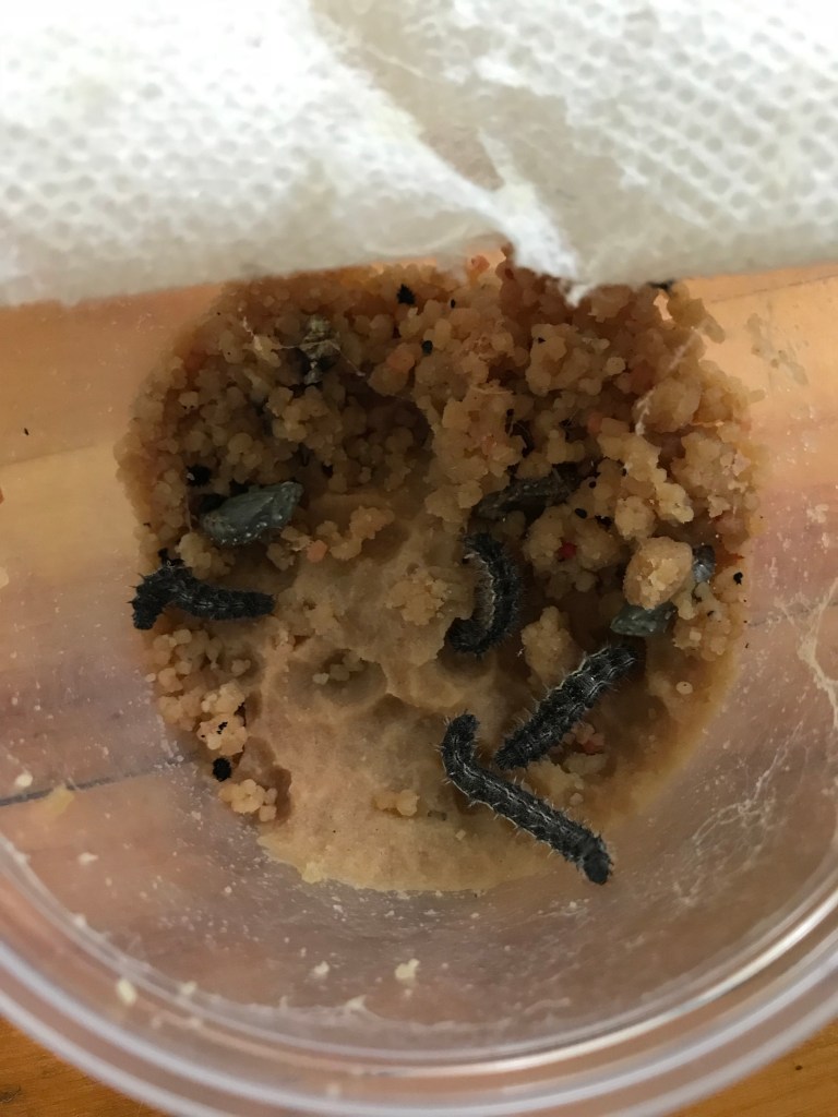 Three of the caterpillars immediately try to escape. Two appear to have formed chrysalises and then fallen into the food. One of them is not moving and is probably dead. 😦