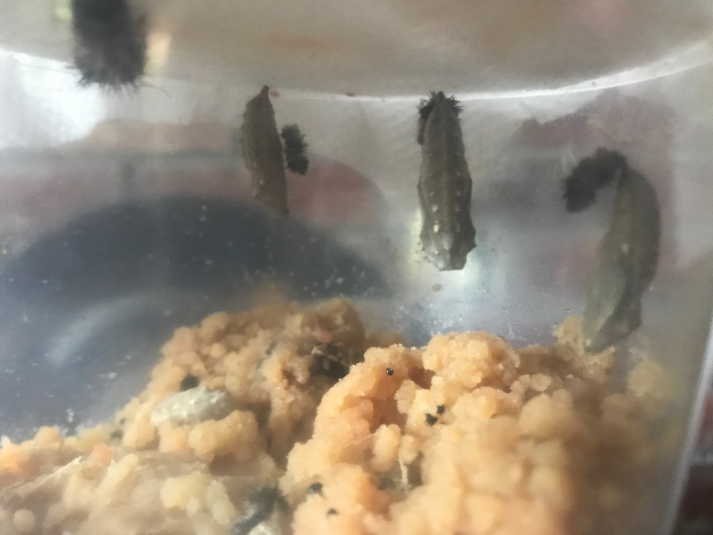 Three chrysalises are hanging safely from the paper towel that we have carefully pinned to the ceiling of their new home. As I’m moving the others, I end up finding more chrysalises buried in the caterpillar food. I place them all on a paper towel and hope for the best.
