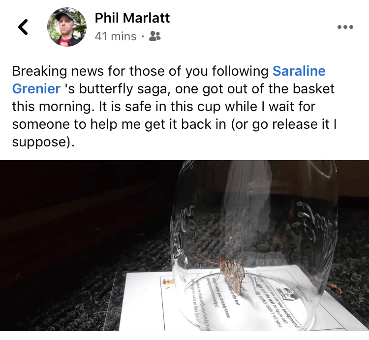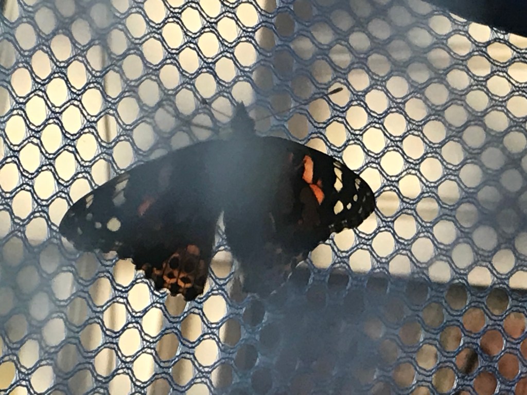 When I get out of the shower, we try to get the butterfly back in the laundry basket (the day is too windy to let them go). It escapes and flies around the living room for a bit before we’re successful.