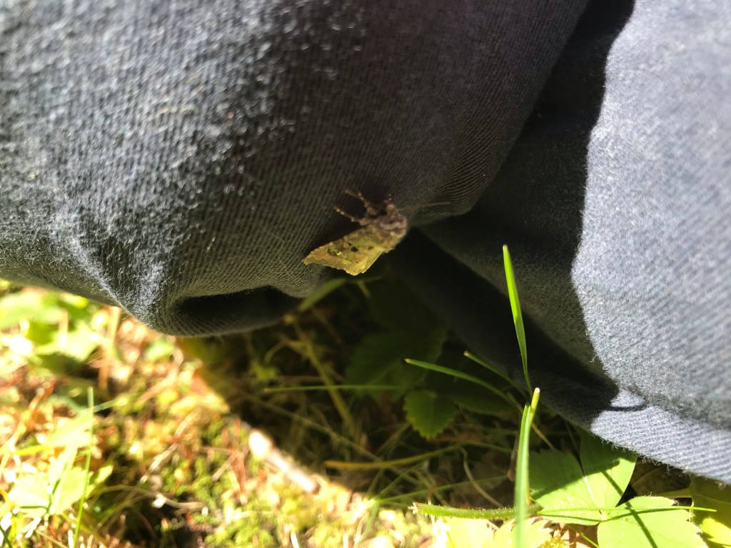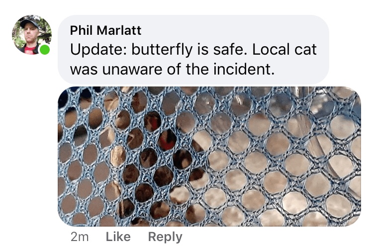 We decide to go in, but before we do, we get the butterfly to crawl onto a stick so we can move it to a more sheltered spot.