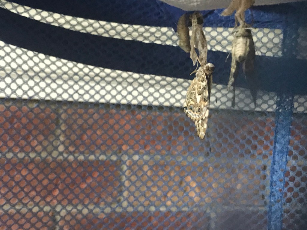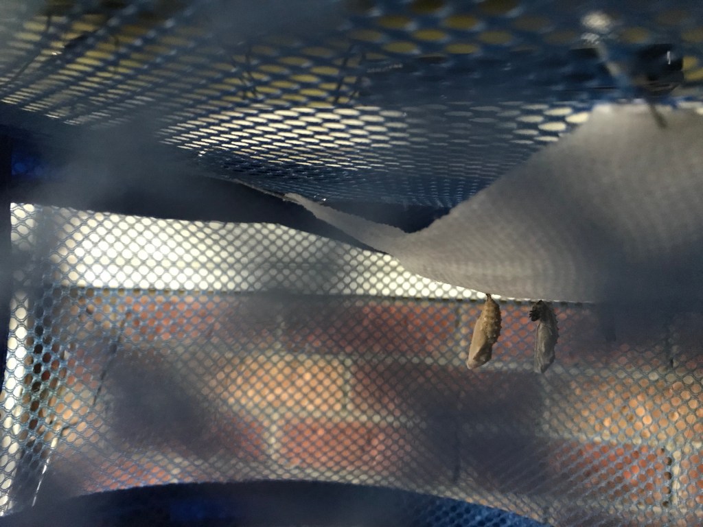 I have since learned that moth caterpillars make cocoons and butterfly caterpillars make chrysalises. I decide to look into this more while I’m waiting for the butterflies to emerge. I read that moths spin their cocoons with silk, which I already knew. What I didn’t know was that butterfly caterpillars shed their skin and the chrysalis is already underneath their skin. I don’t know why, but I’m a bit creeped out by this information.